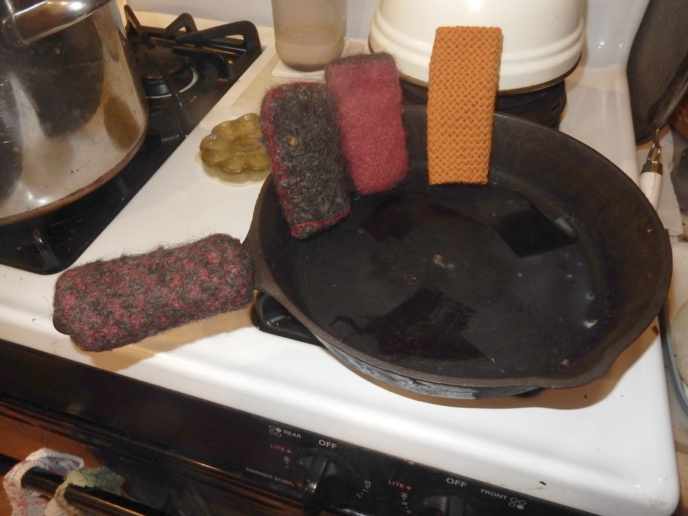 I’ve made and modified the pot holder. Have two more made and one test woven. It’s a light commercial “worsted” woven on the 5″ Quilt Weaver Square. So a test for both yarn and loom size. The dark on on the left is the first one I made using the 7″ and it was a little too long. I rewashed it to felt it a bit tighter and then cut it off shorter. The red one and the one on the skillet handle are both handspun felted max. You can see the pot with the apples there on the left, too.