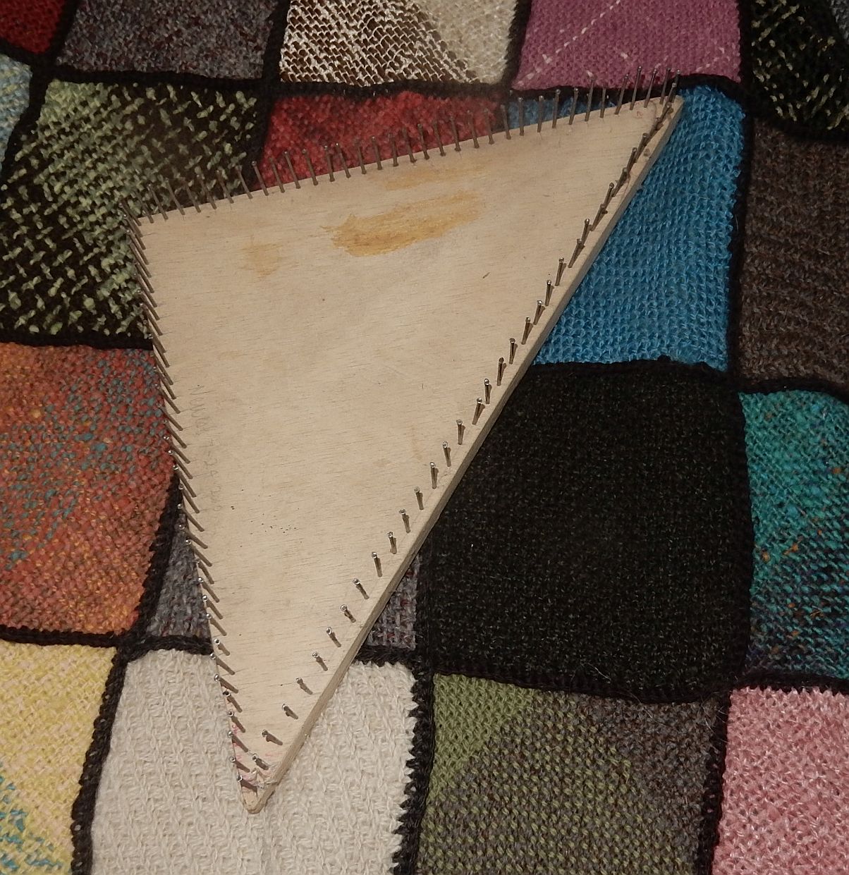 I learned about this kind weaving from my sister who built herself a 6′ triangle for weaving shawls. I was visiting her and she showed me how to do it and I went home and ordered Carol Leigh’s 7′ adjustable loom. I wove a few shawls, Okay, done that. And the loom set up in my small house took up just too much room so one day I got inspired and got some finish nails and some scrap plywood from Randy’s construction stuff and made myself and 7″ tri. I was able to weave these small triangles while sitting in my chair in the evenings.