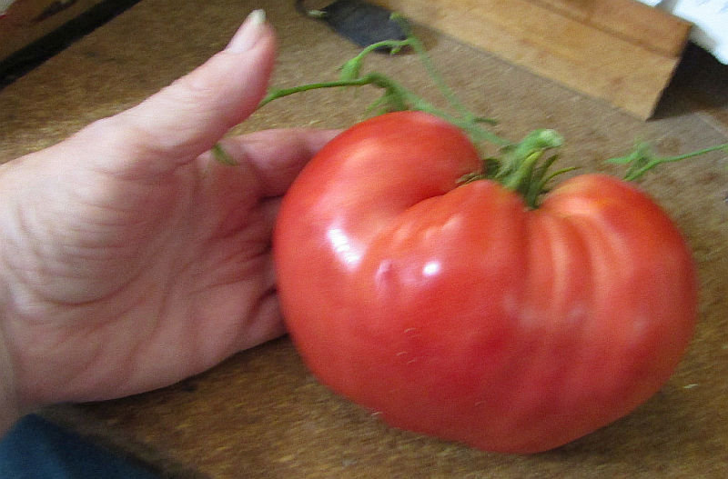 Which makes me late again. Oh well, Late, as the saying goes, seems to be my middle name. But while I have been busy, I don’t know that all that much has been going on. Garden, loom projects, cabin rentals… We had a week of over 100 degrees. It hit 114 one day. Then the next week, this past one .was cool. We had one day with a high in the mid 70’s. I think the drives the garden nuts, too. My peaches are just now starting to soften and we had our first tomato for dinner last night. It was yummy! It’s an heirloom Oxheart. There’s another one ripe now, too, and lots of green ones.