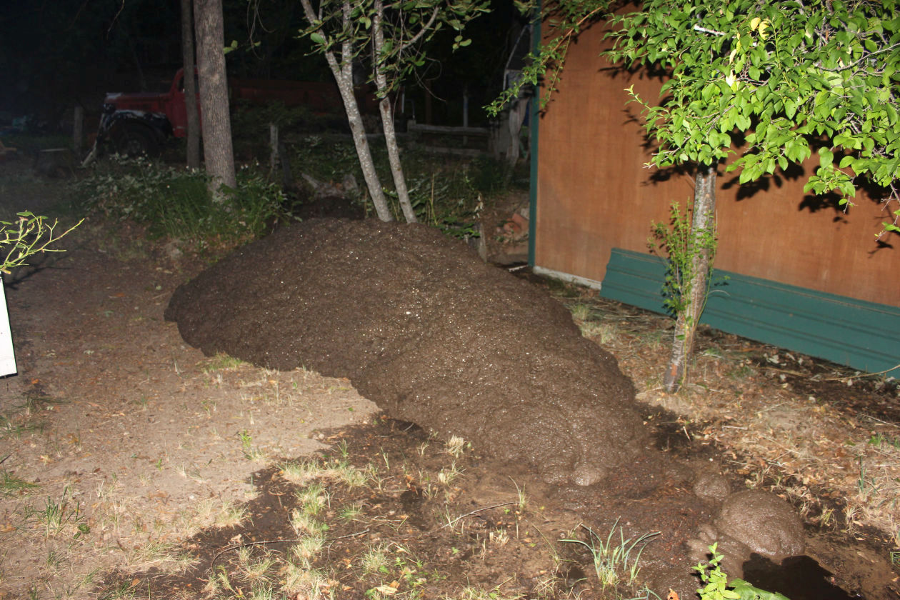 …about 1am I heard water running in the dry flume outside my bedroom window. Our “flash flood” had arrived. It fid not seem enough to worry about so went back to sleep. And it did no damage to us but the poor fishes did not fair so well. Apparently the heave storms were up in the alps in the burn scares from last year. Nothing to stop the runoff & it brought all sorts of mud and muck with it down Coffee Creek, into Treasure Creek and branched into the dry flume though the yard. It’s ugly and it looks like Coffee Creek Road is out again, too. The dump trucks being used for clean up of last years fire went up this morning as usual but came down again empty, which indicates they can’t get to where they are working. A while later some county road dept trucks and equipment went up and we haven’t seen them back yet.