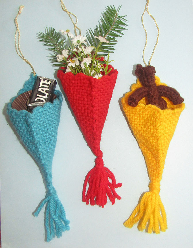 Easy easy as you can see! Fold the square to make a cone, add a tassel to the bottom and a loop to the top. They look pretty int sparkly yarns, too.