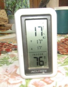High, low, and present temps At 7 am. It’s clear up to 18 now at almost 9 am and the sun’s shinning brightly! But we have power again. After three days without you find out how spoiled we modern folk are! lol But we have plenty of firewood to stay warm, propane cookstove and water heater. Our water is gravity so no shortage of that, tho that spring is just as cold as you’d guess! You have to warm up the tap water before you can drink it! It was kind of peaceful being ‘out of the world’. We didn’t hear any bad news. Any news at all until yesterday when we found out the whole county had been out of power, a lot of damage from the very heavy wet snow. But the good part of that is that it’s started a nice snow pack for next years water supply! Just hope it’s not the last one! Tho I’d not mind if the next one was just a little lighter and drier! There’s just no pleasing some folk, huh!?!