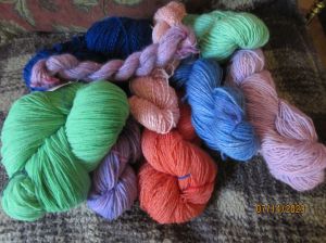 My youngest sister came down from Oregon in July and spent a week with me and we played with dyes! It was fun. Randy set us up a table and a portable gas stove in the yard off the kitchen and we mixed and matched! I dyed some yarns for one of the class projects and she had a lot of her handspun that she dyed, too. It was the first good visit we’ve had in almost a year. I really enjoyed having her here.