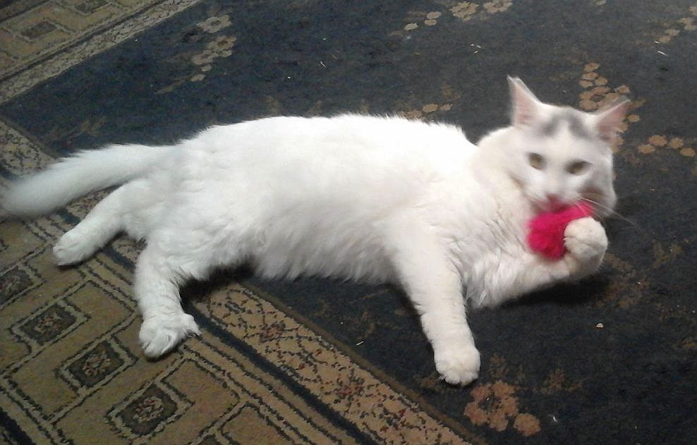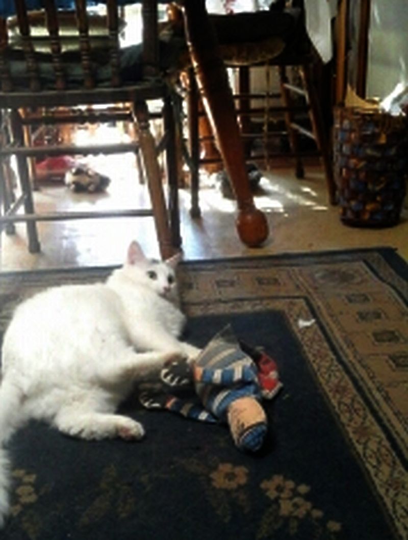 Speaking of Cat, he was getting bored with his toys so I got the Cat Burglar out. It was a favorite of past critters and was a hit with Cat, too. He went from his pink Tribble to the cat burglar and had a great time! The stuffed squirrels that you can see under the dining table have lost their place for awhile!