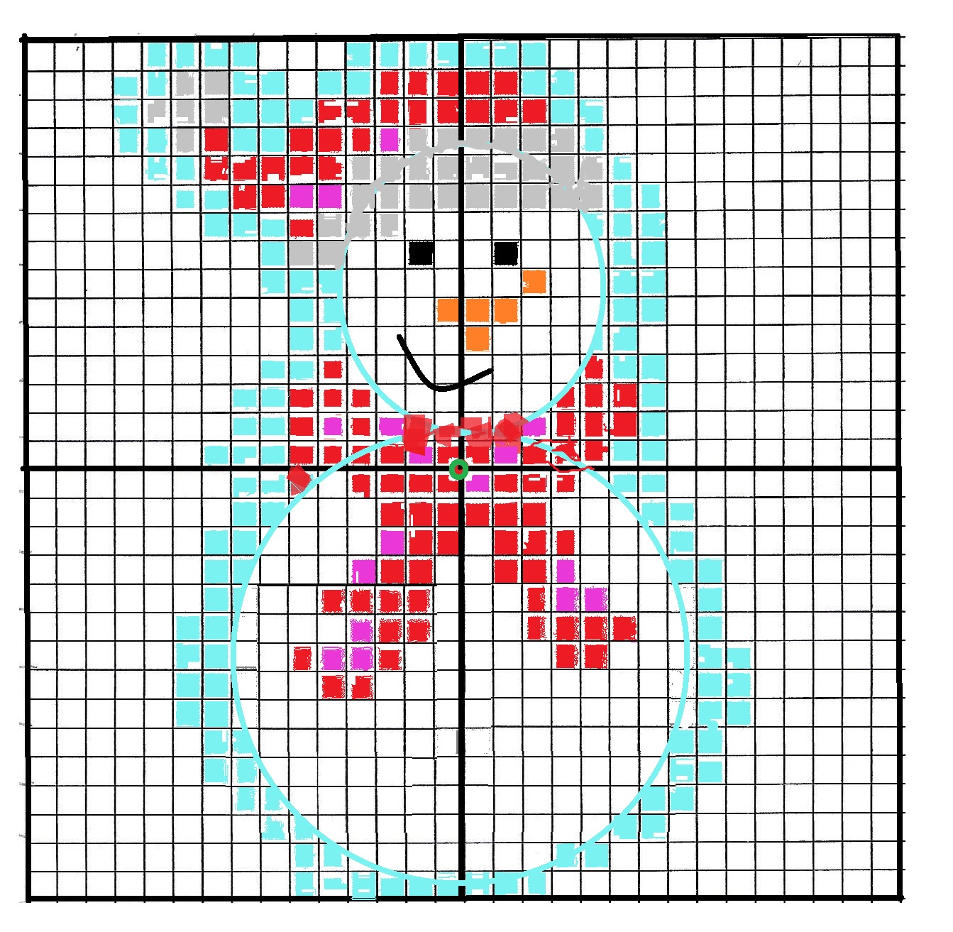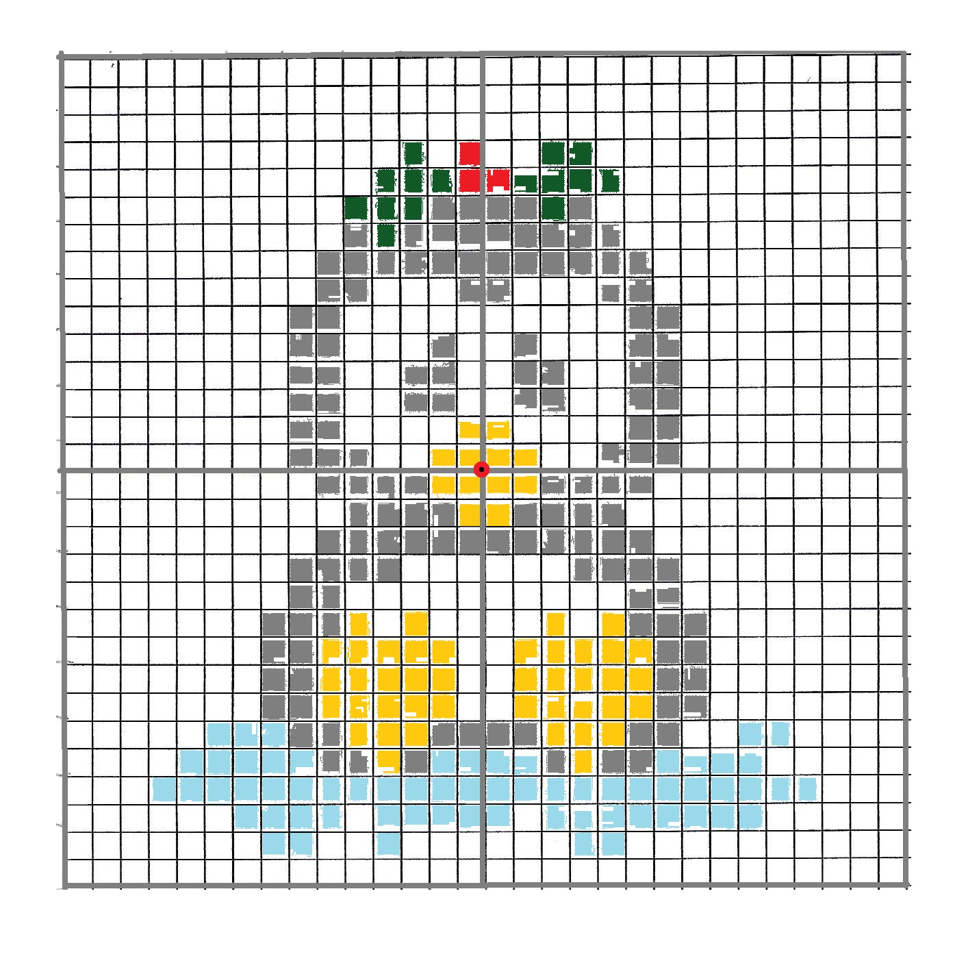 But I did this on the 4″ Multi loom. First you need a graft to fit your loom. I did this for you so you can just print these out and design away! The red dot is the center of the loom to help place your design so that it will fit. You want at least one stitch as a border, more is better, especially of you plan to attach these to other squares. I made a baby blanket using this and some cute little animal pictures. I also added the one with the centered circle in case you ae doing round ornament type projects.