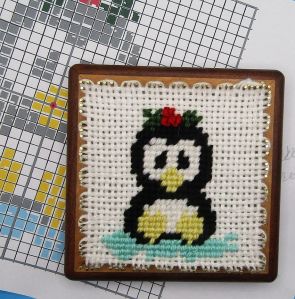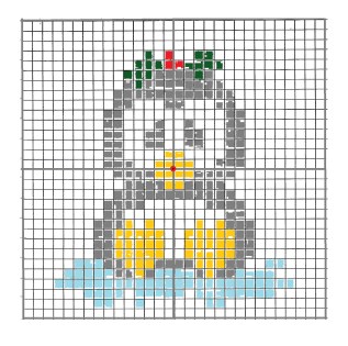 Here’s a couple simple charts you can start with to give you an idea how to go about this. Penguin is worked on a white background, the gray squares here should be black, the snowman needs a color to let him stand out. I just suggest weaving the square with some pale aqua, an icy color then stitching the white for his body. You can do it the other way if you want, stitching the back ground to outline him. You can also use a running stich to kind of outline him. I arbitrarily added a bit of bright pink in his scarf but I have to say, it can and should be done better, You decide!