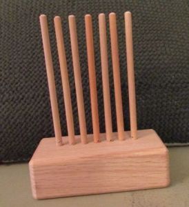 But I guess we ought to talk about Weaving. We have a couple new looms in the works, not ready for debut yet. But I can show you one. I call it Peg, Jr. I’m think of offering a class at one of the fairs using the peg loom and thought it might be fun for parent and kid so we came up with this one with just 7 pegs. Kind of like straw weaving but with a base.