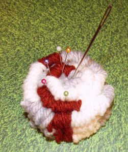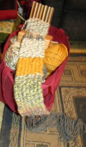 I had him shorten the pegs since this photo & wove a long 3 pin belt which I then rolled up and stitched in place… a pin cushion! And a scarf in the making.
