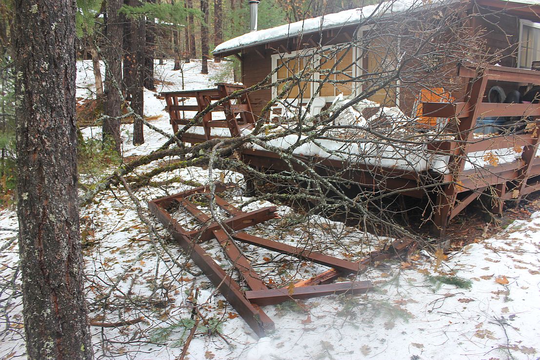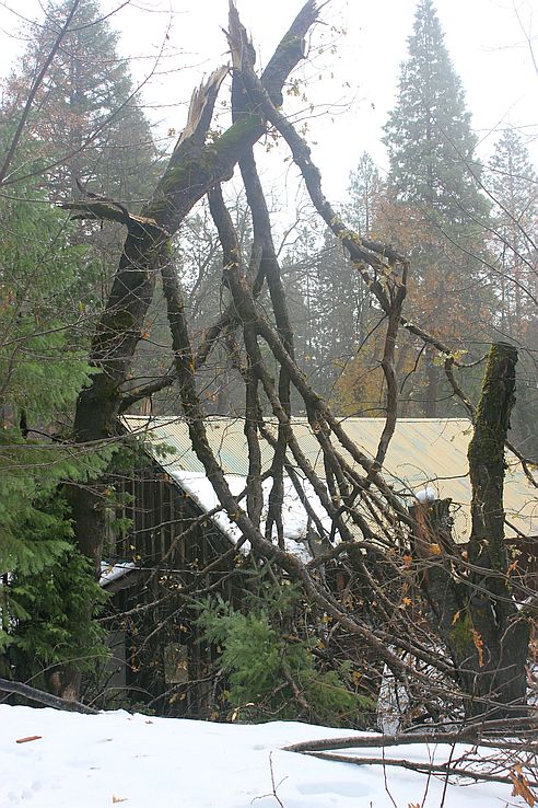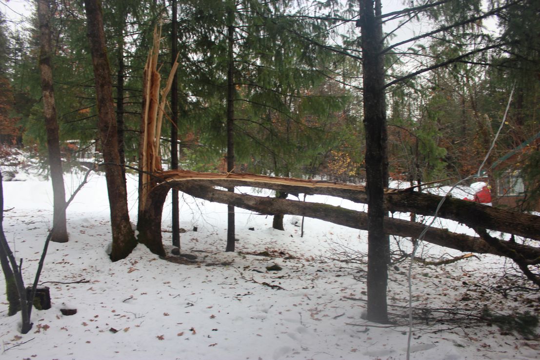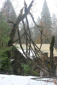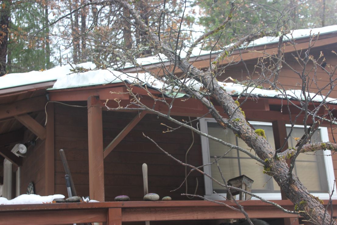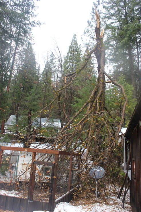 And these were all taken in our immediate neighborhood. Randy cut 4 trees out of Coffee Creek road so that PUD could get up here. The county got here first as PUD had much more work and harder to get to as well. But the guy driving the plow was happy to have that done, he only had to push the pieces off the road, did not have to get out of his warm cab to cut them himself! At least not here. There was a big mess at the intersection of CC rd and the highway. I didn’t hike down there to get that photo.