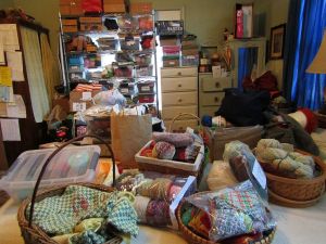 Still morning before, actually, but close enough. Somehow I got involved with my stash storage/bedroom. Was not my intention to spend today that way! But things happen. It started out with Himself commenting on how hard it was to get to the movie storage with all my projects piling up there. So I started “organizing”. That’s a thing I never have been very good at but one thing lead to another and here I am. Nowhere. Yes, I got the pile of projects next to my chair cleared out so he can find his movies but we aren’t going to be able to go to bed tonight until I get this taken care off. It wasn’t bad enough with just my stuff but now I have a bunch of Rosy’s unfinished projects that I thought I could finish for her. Hummm… But it was getting a little crowded on my side of the bed as things kept piling up. Can’t get out to Le Shed these days as there is still snow in spite of the rain. And that hasn’t helped, making things slushier and harder walking. I’m probably going to have to tackle the closet, too, in order to make room for the stuff on the bed! It is a vicious circle, isn’t it?! That old ‘going though life But first’. I’ll put this away But First I have to straighten out the closet!