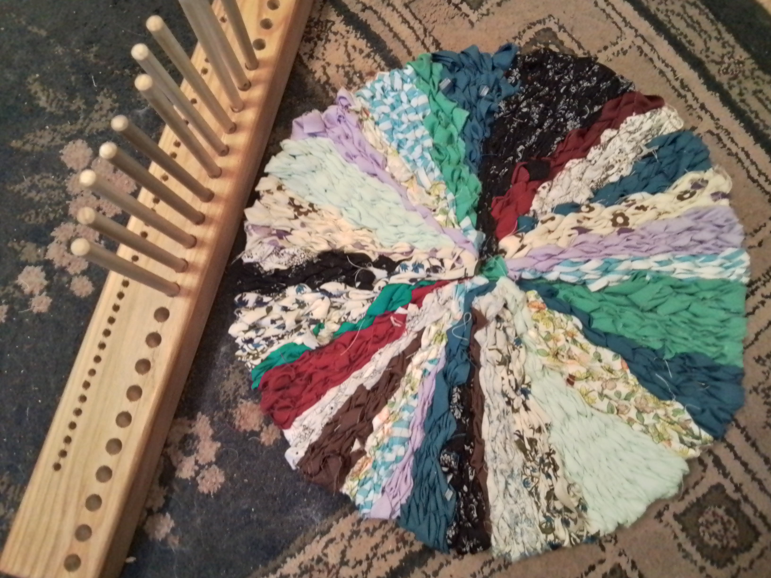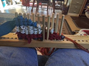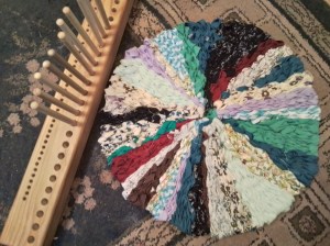 But meantime, I am learning that there is more to weaving on the peg loom than at first meets the eye. I got my circle chair pad woven but there are a few things I need to pay more attention to. I got the warp lengths right but had a difficult time pulling the warp through the outside rows. I’m about to start the 2nd pad so will be paying more attention to that. But all in all I think it came out pretty well. I used fabric strips with some stash Aunt Lydia rug yarn for warp. Thought I’d better add a bit about the 2nd picture. I did not skip pegs, I just found that slipping the center pegs thought before the end pegs helps keep them from coming off the loom while you are moving the warp up.