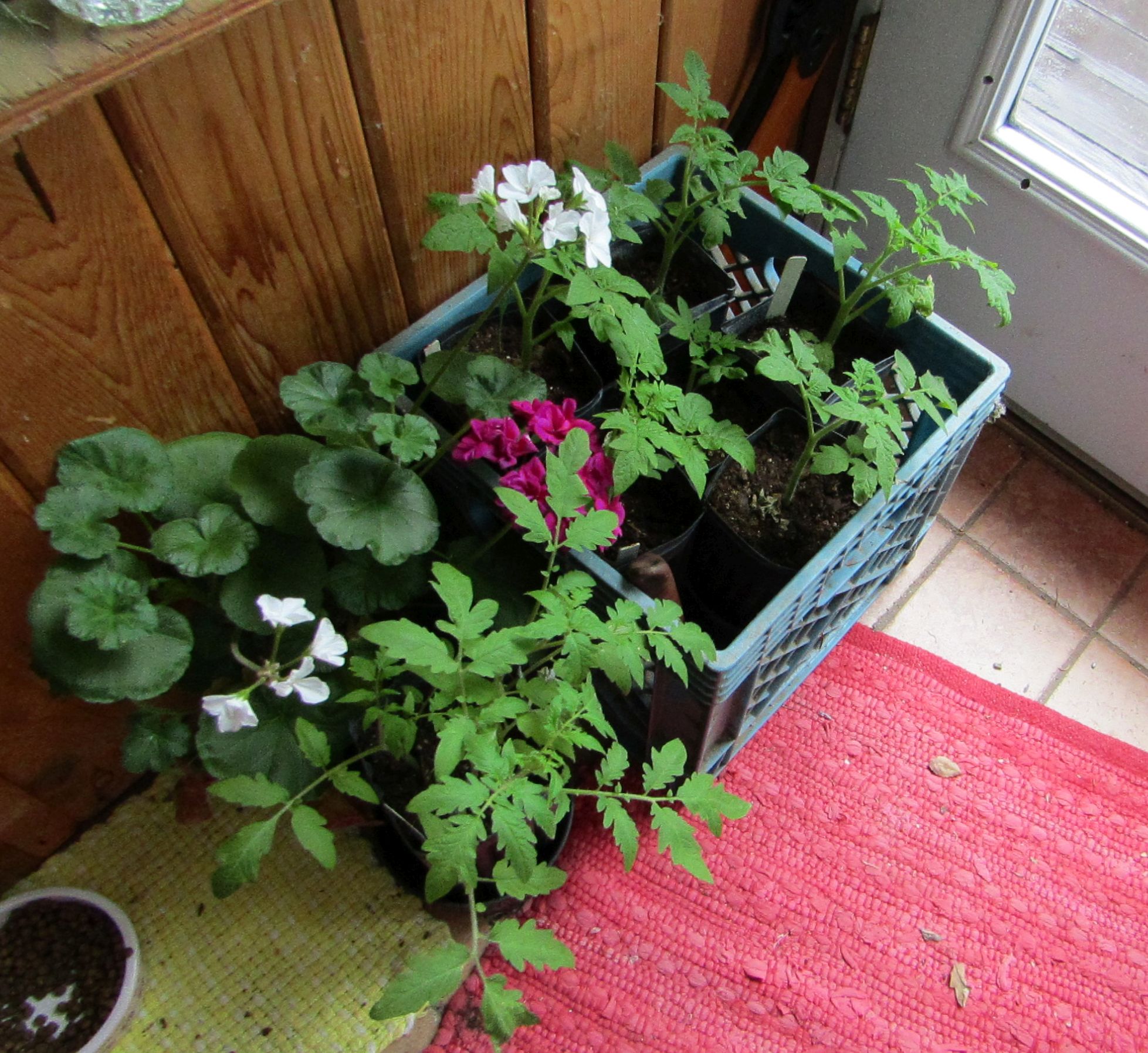 But now it’s raining on that lovely snow. Yeah, that’s spring! Mother Nature will give us a few more sunny days, probably at least one more snow, lots of rain (if we’re lucky) and then sometime in May it Will be Spring! And we can start garden again. Strange about garden. By October I am so tired of garden, I don’t want to ever see another green bean or red tomato but by the end of February I can hardly wait. In fact, I didn’t wait this year. I planted my tomato’s too soon. They are going to have to live in pots indoors much longer than they ought. I don’t know why I thought it was time. A little sunshine does not make a spring, I should know by my age! Oh well… I guess we’ll all survive. Here they are keeping company with some geranium starts, all leaning toward the door where a little dim light is sneaking though the clouds. Yeah, I have a grow light but they are now too big to fit under it.