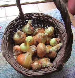 Too many beans and cukes, they out produced all the rest! I am pleased with my onions this year. I’m sure Rosy is proud of me. I always got my onions from her as I never had any luck with them. But now I have to do it on my own so tried extra hard. They aren’t going to win prizes at the fair but they are the best I’ve grown so far! There are red ones in the bottom. We’ve used quite a few already