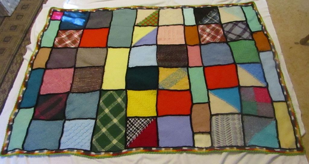 Okay, I didn’t even get this one posted but am in a better mood today so will just leave that but add some more cheerful stuff. Like this afghan. I thought I could put it out on the deck to dry for blocking. We swept off the oak leaves that were piling up but it’s still very wet and tho the sun is shining it isn’t getting in past our trees to dry the deck. So I gave up and layed it out on the LR floor. Himself has a nice fire going so it ought not take long to dry.
