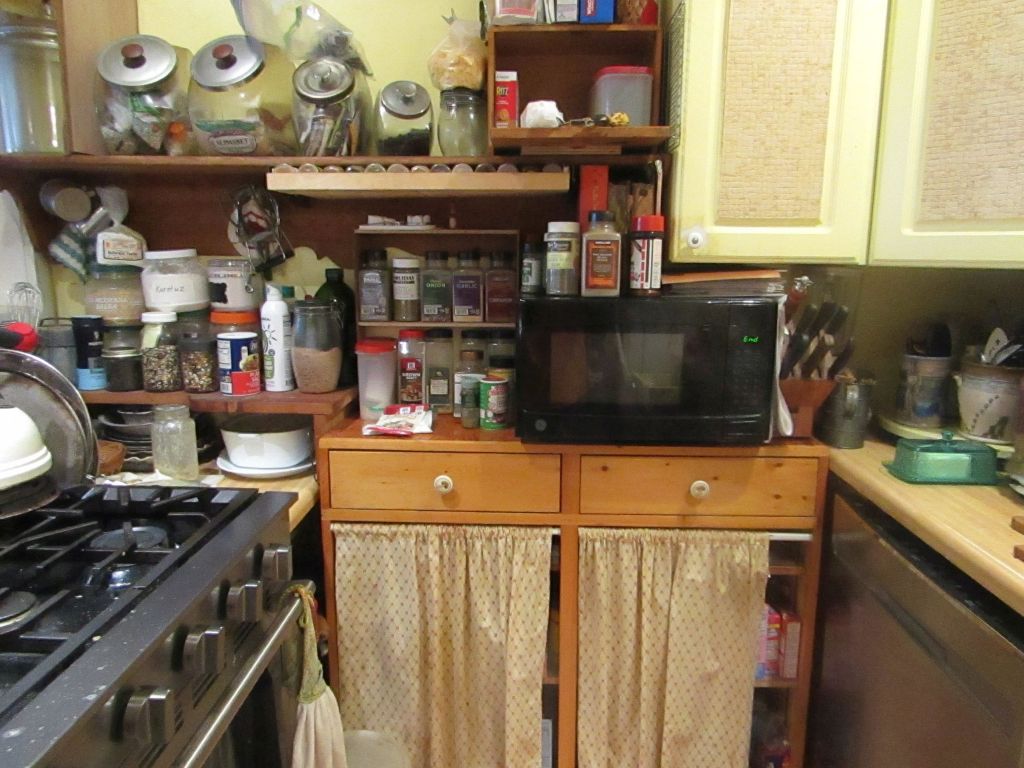 You might think this still looks clutered but it is lovely! My kitchen is tiny. On the left is my stove and there is 18″ of counter after that then the proch door. On the right next to the dishwasher is the sink, 12″ of counter, and the fridge. There’s a couple cupboards on the sink side and a window above the stove. That’s my kitchen. But I get breakfast & dinner made daily and all the canning done in the summer so you can say it’s big enough. Okay, I need to be working on the fridge instead of talking to you.. Remember, that’s need, not want! I hope you are having a sunny and cheerful day!