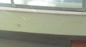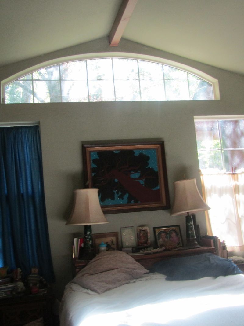 I don’t nap in the bed. That is until today, and when I go to bed at night, I feel my way there, my night vision being negligible and all the lights out since He’s usually abed and asleep by the time I get there these days. But the point of this ramble is that, yes, I know there are spider webs on this window but as I cannot reach it, I don’t worry about it. And the dirtier it gets, the less the full moon will be keeping me awake each month. At least that is my attitude. But laying there this afternoon, I saw things from a different point of view. I laid there because I thought it might help straighten my back which gets pretty hunched by this time of day. Looking up I saw a really impressive net of webs in front of the glass. I’m glad I can’t see the ledge under this window because I have feeling that it’s probably littered with bug corpes! These ladies are pretty good at keeping the webs clean of this sort of thing, tho they do get dusty and instead of running their little vaccums they just weave new clean nets. Ah well. I tend to go for the easy cleaning also. I spotted 4 of them sitting patiently waiting. I think they are going to get hungry before more meals fly in since it is not getting very warm and we have another week of clouds and possible showers so nothing open for fliers in. For perspective, this is a shot of the head of the bed and the window he fell in love with. I tired to get it in the LR but there wasn’t room with it’s lower cieling. It’s way too much light for a bedroom but he can sleep with any amount of light and I have a black sleep mask.