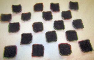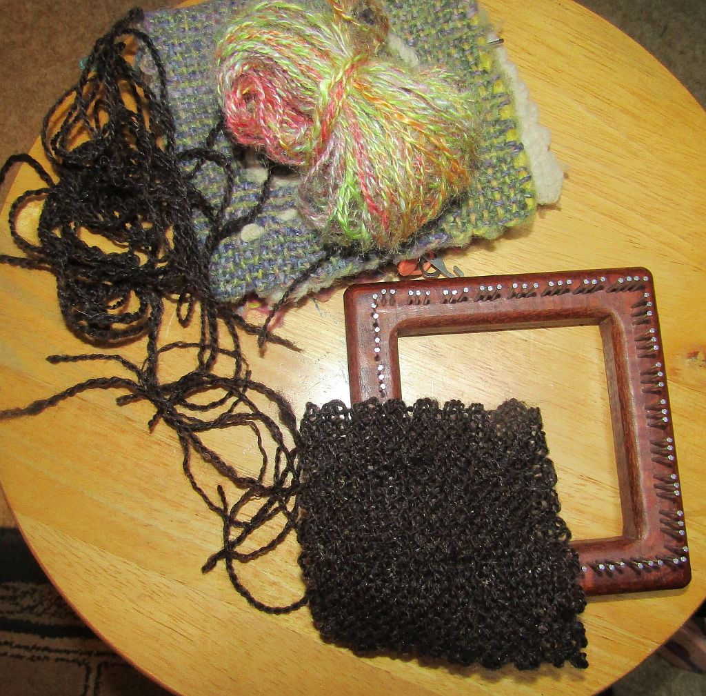 I got the edging finished & laid them out. It made a rather tiny rectangle so I decided to space them a bit more. I’ll go out to Le Shed and go through the bin of Rosy’s small skeins. I’m sure she spun somthing that will go with this. The problem will be to find a compatable wool, size, and yes, color. Sis didn’t often spin for a project. She spun because she enjoyed spinning. In fact, she enjoyed making yarn, often starting from skirting, washing, carding, & dying, and of course the spinning, but she like to experiment so finding yarns that go together can sometimes be a challenge. It turned out that for this layout I was one square short but I manasged to find enough useable bits to weave another square.