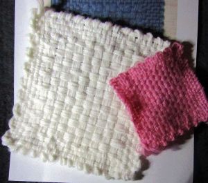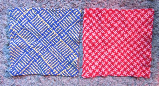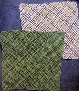 I have been doing a bit of weaving. Did some domestic stuff, dish cloths. Needed some new ones and wanted to try them on the 10 1/2″ loom. It’s been popular with weavers but I’ve always used the 12″ for my dishcloths. So I figured while I was doing it I might as well use up some of the cotton stash and weave a couple fancy ones. The first two I wove on the 12″ using my “grease rag” colors. That yellowy looking one is actually brown but my camera decided to “improve” on it I guess. I used the Random pattern (which you can find in Pages) for the blue one and the Red and white is the small hounds tooth, which is just two rows of each color, repeat.
