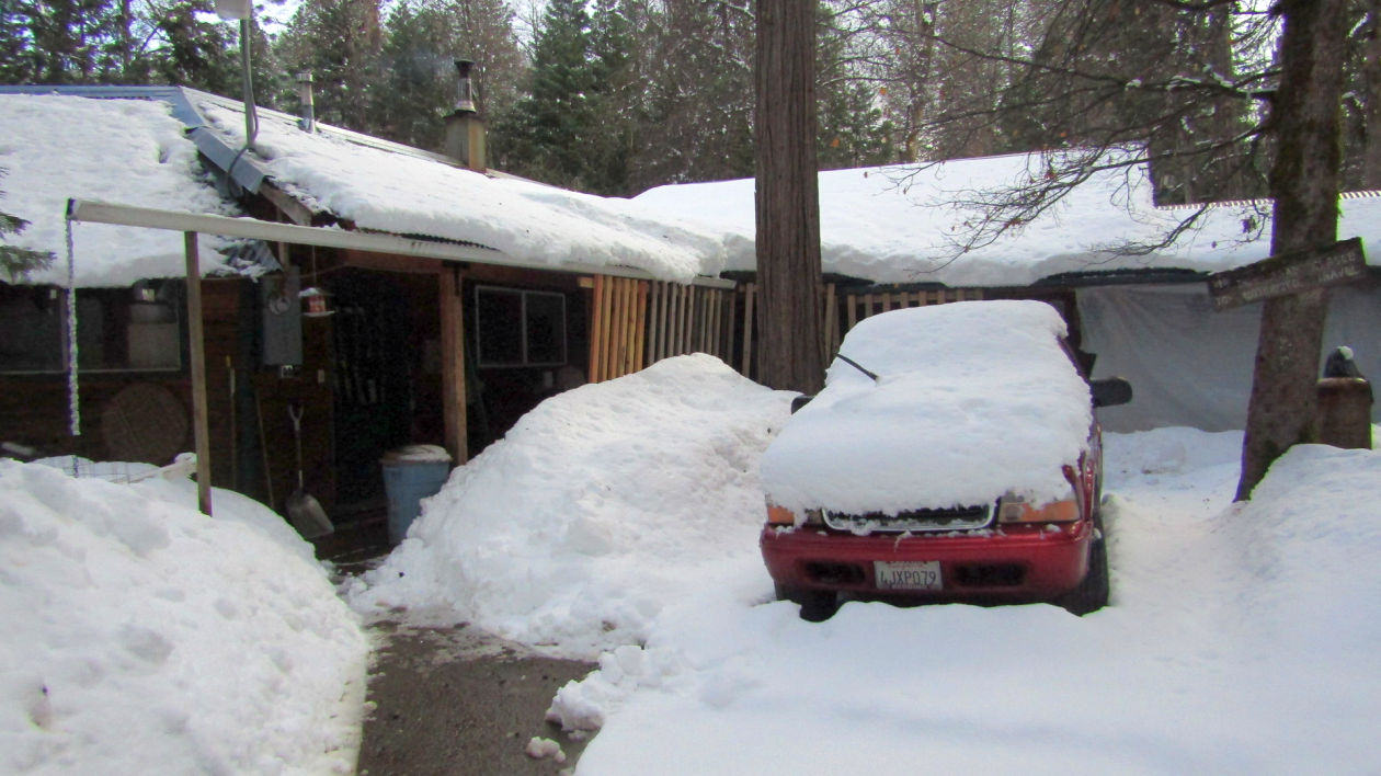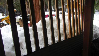 I’ve been showing you the deck side, the “pretty side”.  Thought I’d give you a view of my kitchen side. That’s my car, the shop behind it. The white area to the right of my car is the tarp that helps keep the snow out of the wood shed behind it. The path he’s shoveled leads to the porch and kitchen door. The 2nd picture was taken from the kitchen door though the snow boards which keep the snow off the porch. For the most part. Snow did a lot of melting today but there’s more scheduled for this week.