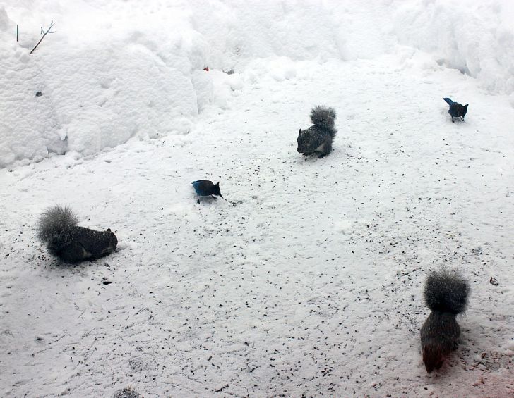 And Himself likes feeding the birds but he doesn’t use a bird feeder just tosses it on the deck and in the snow. The towhees and Junkos were missing in this photo as was the little tree rat, the pine squirrel. He’s better stay missing! But the greys and the Jays were there for breakfast! You can tell that He’s generous with the expensive bird feed, too! Ah well, they are entertaining. This is our deck, by the way. Getting deep around the edges! lol