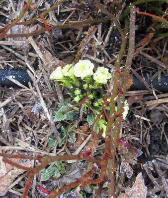 A crocus, reluctant to open in the frosty lawn and one of the first primroses blooming under a budding mini rose.