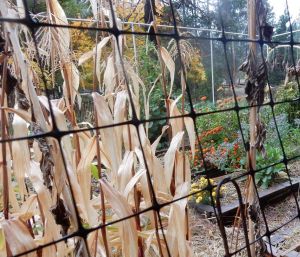 End of gardening season. A few hardier flowers and his pole beans still producing a few.