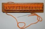 Meantime, you will need your loom, a weaving needle, and your yarn. The needle you can buy are a low cost at most any carft or yarn store. The Yarn can be fingering, Knit Picks Palette makes a thin, light fabric, but suitable, Stroll sport is the one I used for this dress, and have also used light weight worsted sizes. Unlike knitting, which will change the size of the garment when you change the size of the yarn, these squares will always be right around the same size. What does change is the texture of the fabric. The heavier the yarn the stiffer the fabric. If you decide to use the self made loom, I’d advise using the finer yarns so as to put less stress on your little loom. The hard wood looms are stronger and can handle the draw-up for any of these yarns, of course.