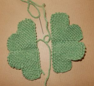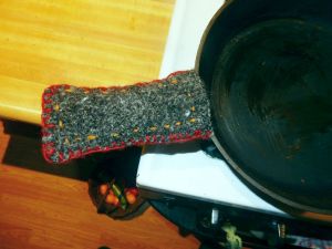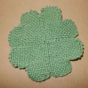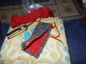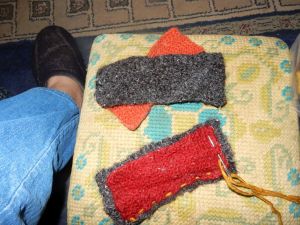 But I also have a long rip in my pant leg so thought I’d weave one of those colorful patches. Rooting around in the yarn bin I found a bag of already woven 4″ squares in a colorway in Opal sock yarn. And I have a couple shirts that are just right for this kind of thing so now I just need to stitch it on and wash. And there are enough patched left to patch the pants!