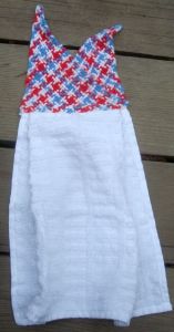 This is a photo of the first one I made before I chained on the tie strings. It is no longer photogenic! lol But it’s been very handy and is still working despite it’s less than stellar condition. This one was pleated rather than gathered. You can do the dame thing with the towels you weave, too. But this is a quick  project. They make nice gifts as well.