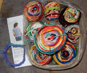 I mentioned (for the umpteeth time) to my sis that I really need to post to this blog, but nothing worth writing about has been happening. She said forget writing about the exciting, just write about your life, what you do. Or something to that affect.  So: I have no loom project going. Well, one old one that I’ve been ignoring. I just can’t seem to come up with any ideas that get me excited about anything. Have not knit a doll thing in over a year. I started knitting a sweater for myself last summer and it’s been idling in a bag by my chair. But I found a new project today. It’ll be also one that takes years but this one I start off knowing that. I’ve saved my bits and pieces forever. Every now and then I get the box down and tie them together, making some interesting yarn. And I just happened to see a pattern that is perfect for it. So I have cast one for my Waste Not Sweater Tee.