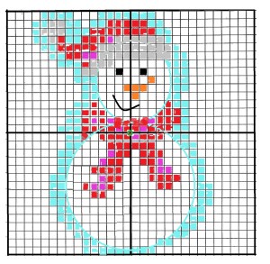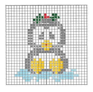 Here’s a couple  simple charts you can start with to give you an idea how to go about this. Penguin is worked on a white background, the gray squares here should be black, the snowman needs a color to let him stand out. I just suggest weaving the square with some pale aqua, an icy color then stitching the white for his body. You can do it the other way if you want, stitching the back ground to outline  him. You can also use a running stich to kind of outline him. I arbitrarily added a bit of bright pink in his scarf but I have to say, it can and should be done better, You decide!