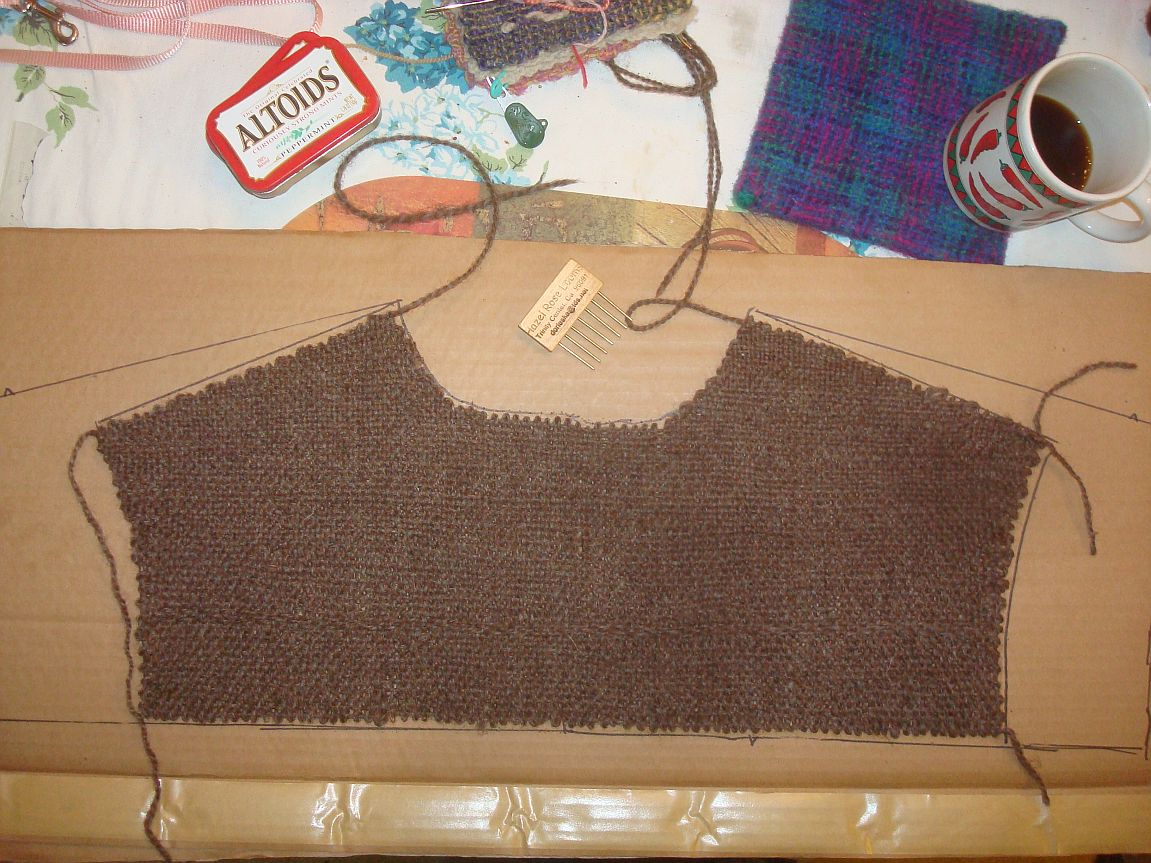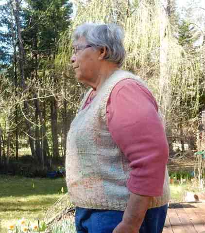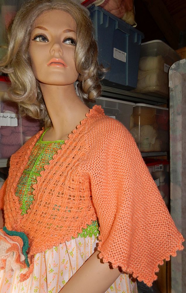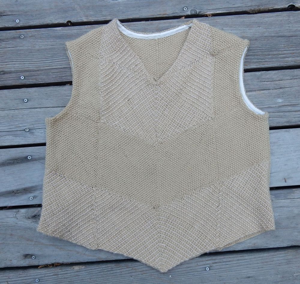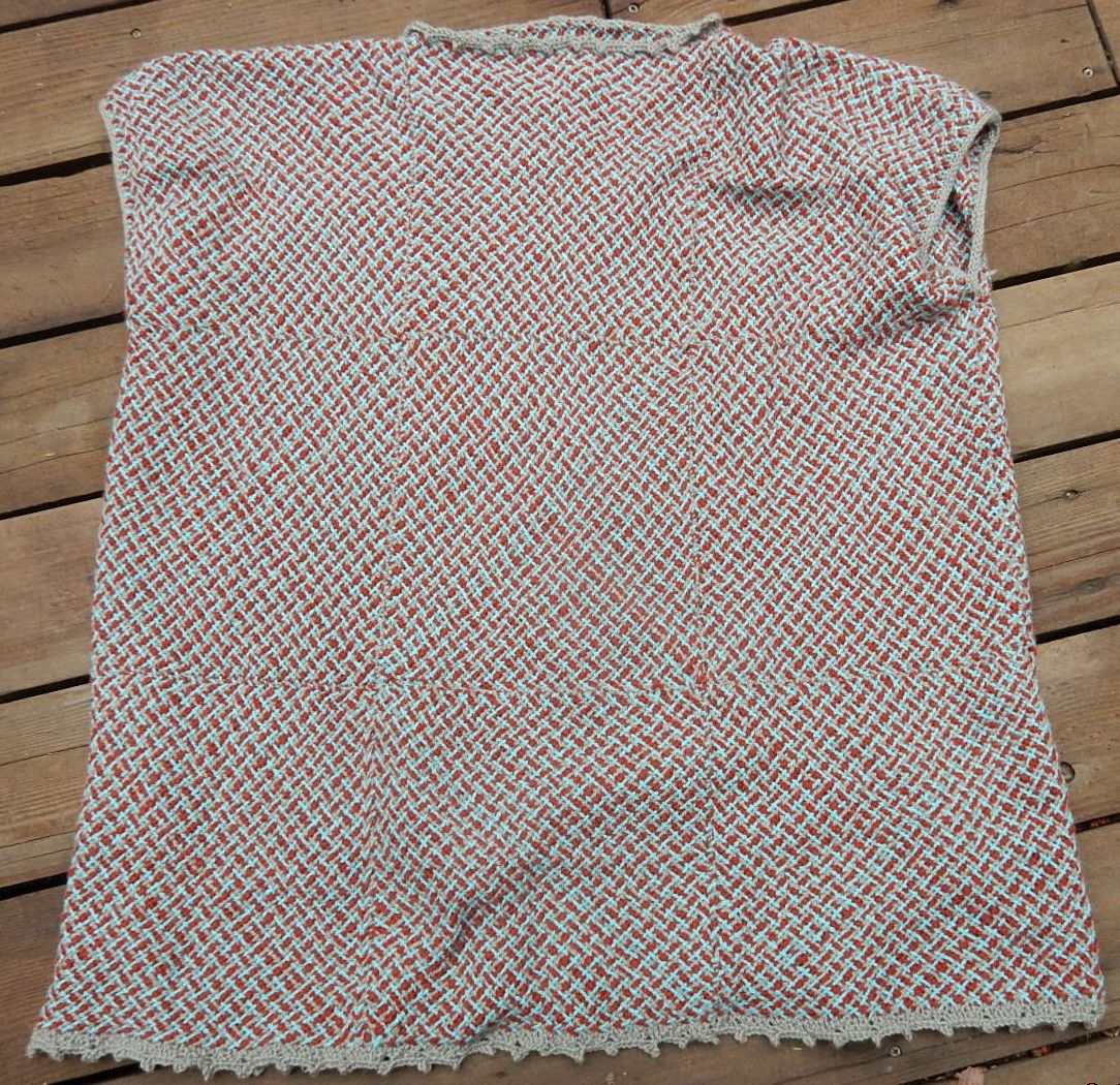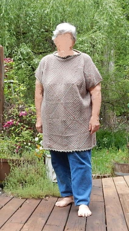 And I found an anonymous old lady to model it. I think I need some sleeves under but this yarn does not sit well over clothing. It sticks and refuses to drape as it should. Works like your old sunday school flannel board! lol But this yarn is soooo comfy! Even tho it isn’t really a flattering garment I might wear it a lot just because it feels so good! I am at least happy that I finally found a use for all those squares and that lovely yarn. Now I just have a vast selection of demo squares to make into something. And as we are coming up in fair season again I think I should plan a bit better with yarn choice so that I have a better chance of actually using the squares I weave while showing folk how it’;s done.