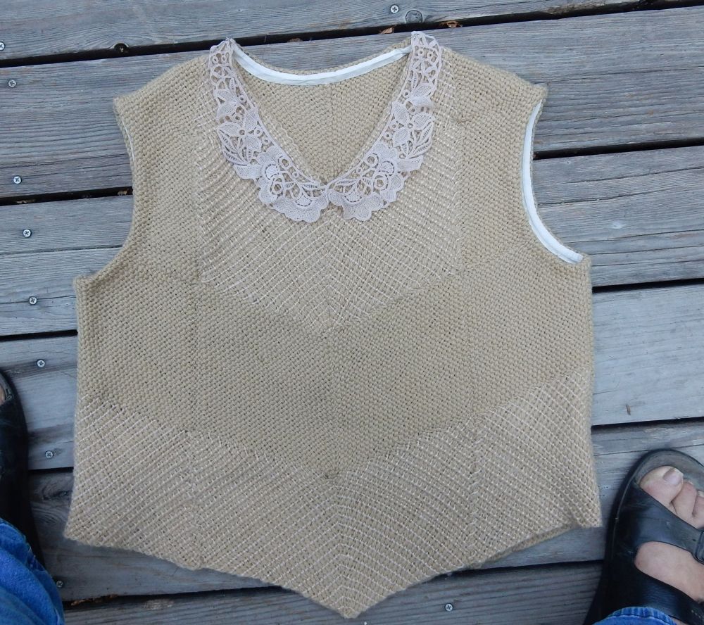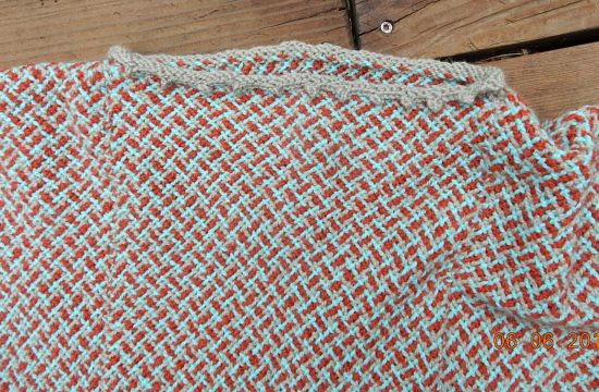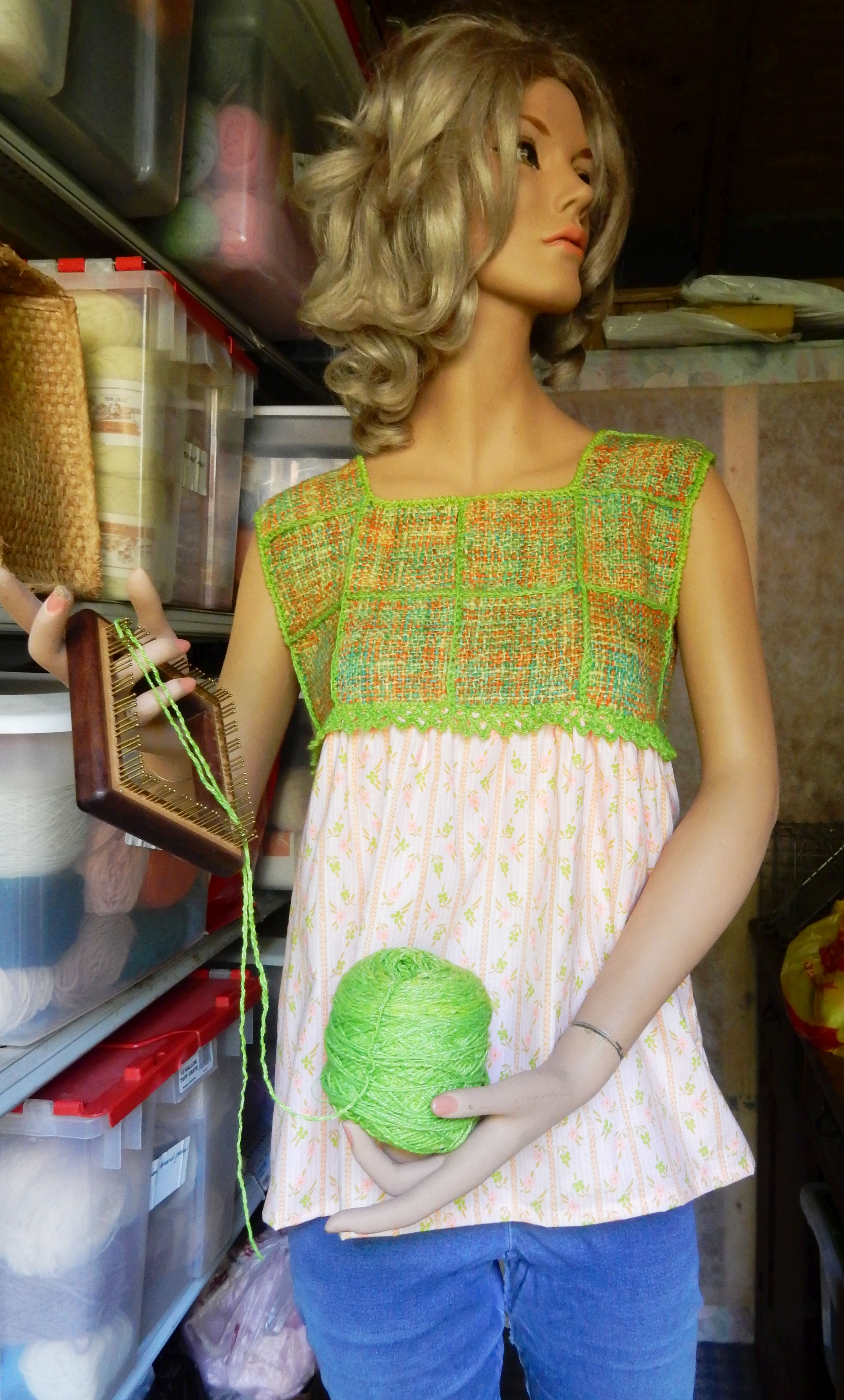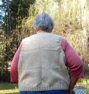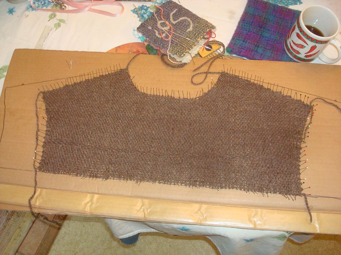 And I found an anonymous old lady to model it. I think I need some sleeves under but this yarn does not sit well over clothing. It sticks and refuses to drape as it should. Works like your old sunday school flannel board! lol But this yarn is soooo comfy! Even tho it isn’t really a flattering garment I might wear it a lot just because it feels so good! I am at least happy that I finally found a use for all those squares and that lovely yarn. Now I just have a vast selection of demo squares to make into something. And as we are coming up in fair season again I think I should plan a bit better with yarn choice so that I have a better chance of actually using the squares I weave while showing folk how it’;s done.