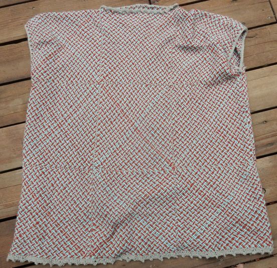 …Like you do with my promised posting! Ah well. I frogged the supposed shrug as it was a garment no one could wear. Now it’s just a plain tunic, comfortable but not very flattering for me. There is no shaping, I could not find a belt but as I have no waist, I’m not sure that would matter. I thought of letting Madelyn model it but it’s way too big for her.