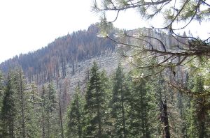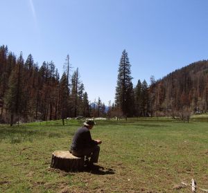 We walked down and took a look at the meadow from the bottom, The fire came down into the Aspens, but didn’t hurt them. We only have this one patch of them in Trinity Co. That I am aware of, anyway. Here’s Himself contemplating the view. Yo can see the brow trees. But there’s still green ones, too. Still birds and a nice sized deer herd so lots of things survived the fire.