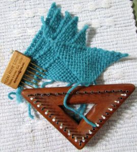 So I’m weaving little triangles today. Don’t know what I’ll do with them. Maybe a quilt design. But they’re easy and fast using the Tiny Weaver Tri.