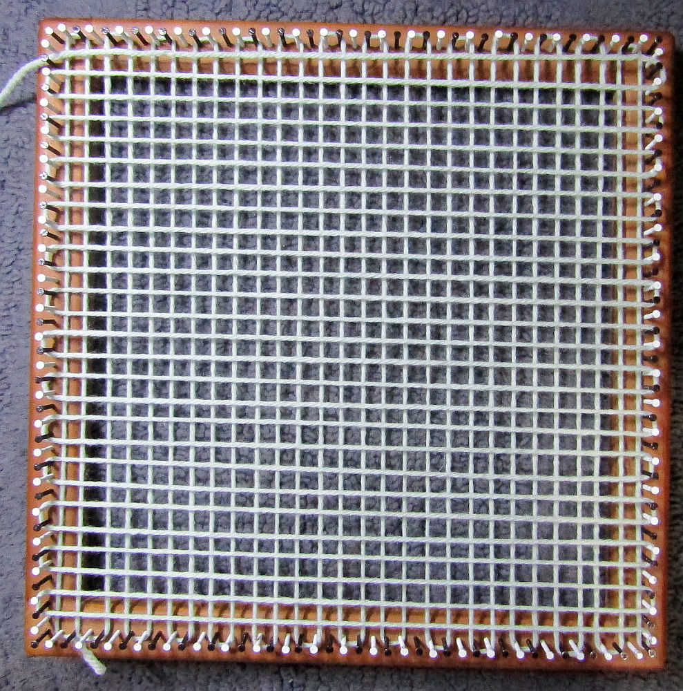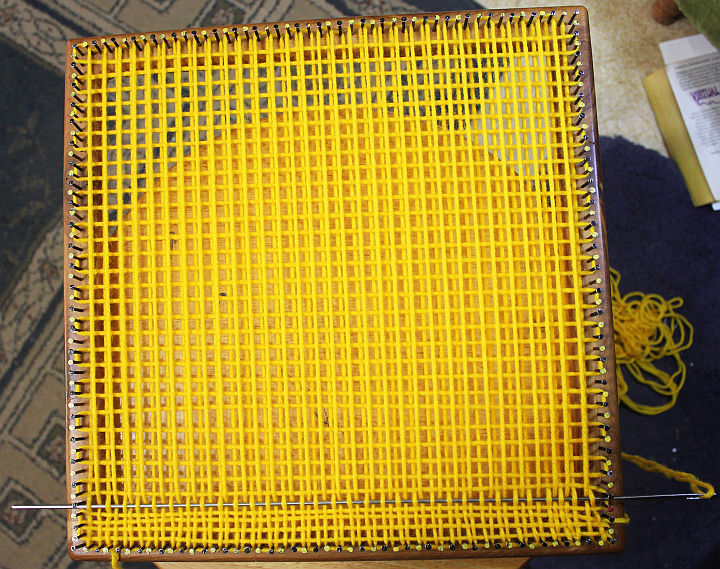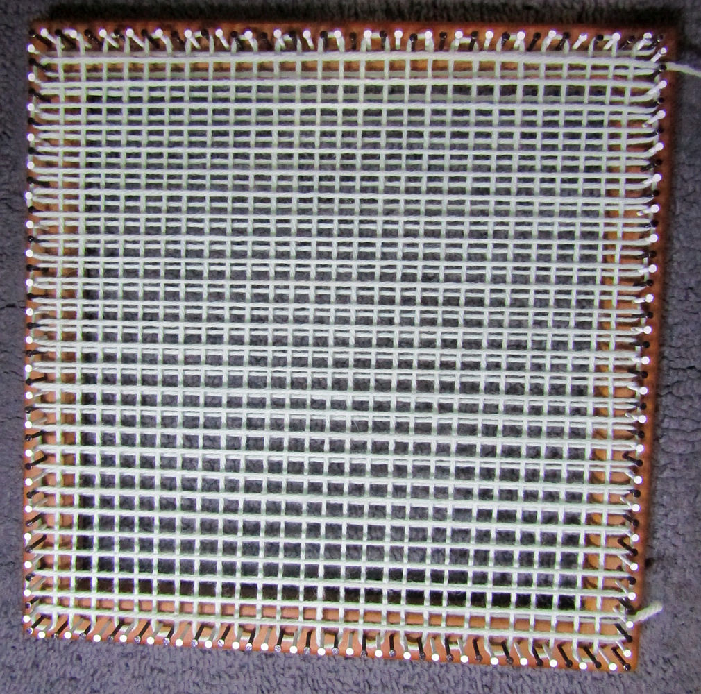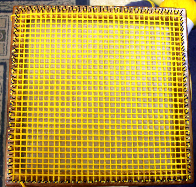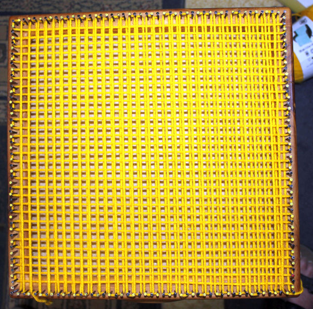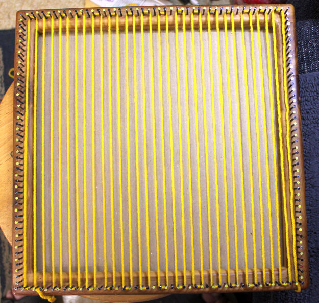 You’ll need about 12 Yards of yarn to weave this square, that’ll be about 9 wraps around the nails.