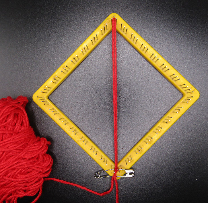 - With your starting color, make a long slip knot and place a safety pin in this loop. Put the loop over the top pin with your working yarn to the bottom and the safety pin on the outside of the pins as in the photo.