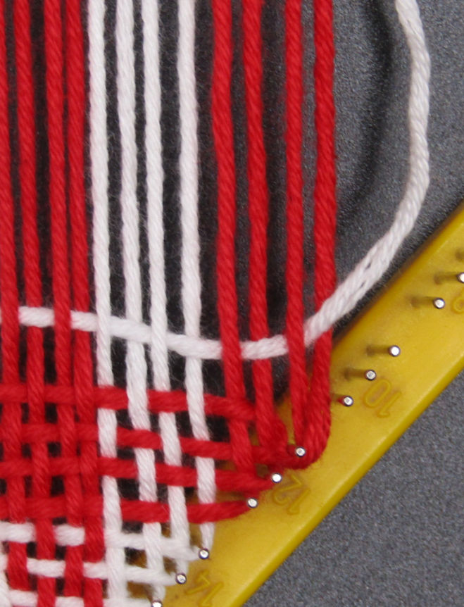 2. Weave another round, being careful not to twist the first loop. Continue weaving until you reach the 9th pin. Because the number of pins on the sides of this type of loom is uneven you have to “add” a pin. Weave the white though but before you place it on a pin, move the previous colored yarn down to the pin before it. Then place your white yarn and continue weaving.