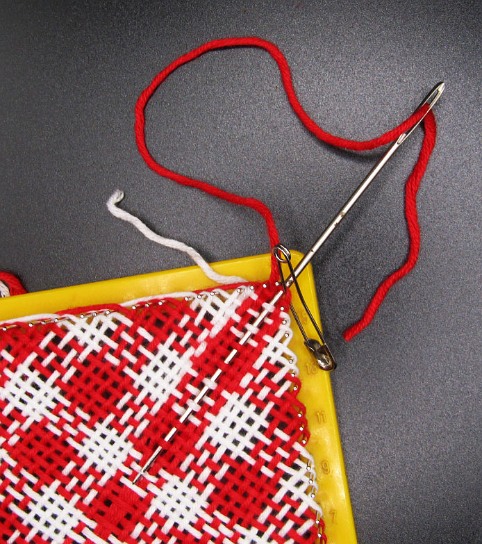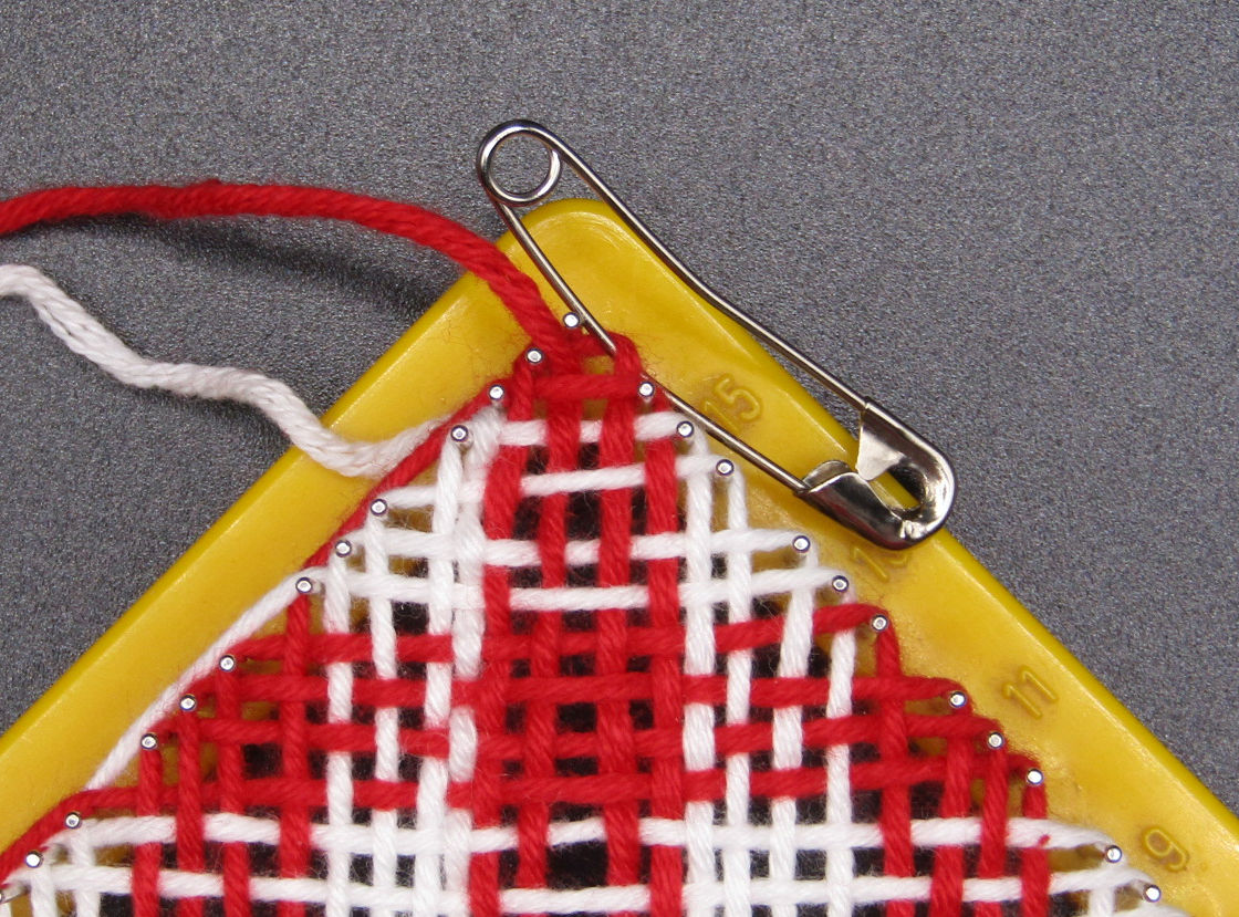 3. When you reach the next to last round you will once again find you are short a pin so get out another safety pin. It replaces the pin just to the right of the corner pin. Weave the 4th row. This pattern requires a 5th row to finish. At this point you can cut your white yarn leaving a long enough tail to weave it in later if you wish. Cut the colored yarn long enough to weave though with at least a 4″ long tail. At this point you can use the needle that came with your loom or finished with the hook if you prefer. Now you are done! Take it off the loom and start another!